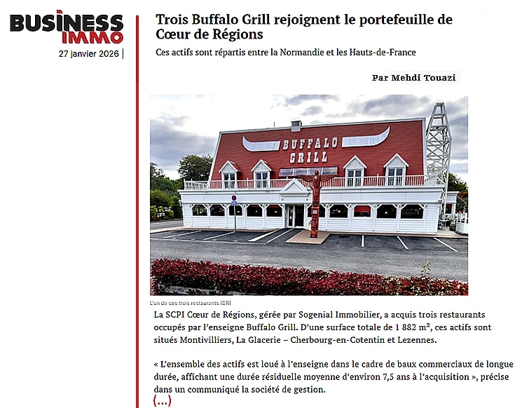 BUSINESS IMMO : Trois Buffalo Grill rejoignent le portefeuille de Cœur de Régions, ces actifs totalisant 1 882 m²sont répartis entre la Normandie et les Hauts-de-France par Mehdi Touazi