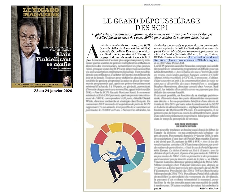 LE FIGARO MAGAZINE : Digitalisation, versements programmés, décimalisation, les SCPI jouent la carte de l’accessibilité pour séduire de nouveaux investisseurs par Valérie Valin-Stein